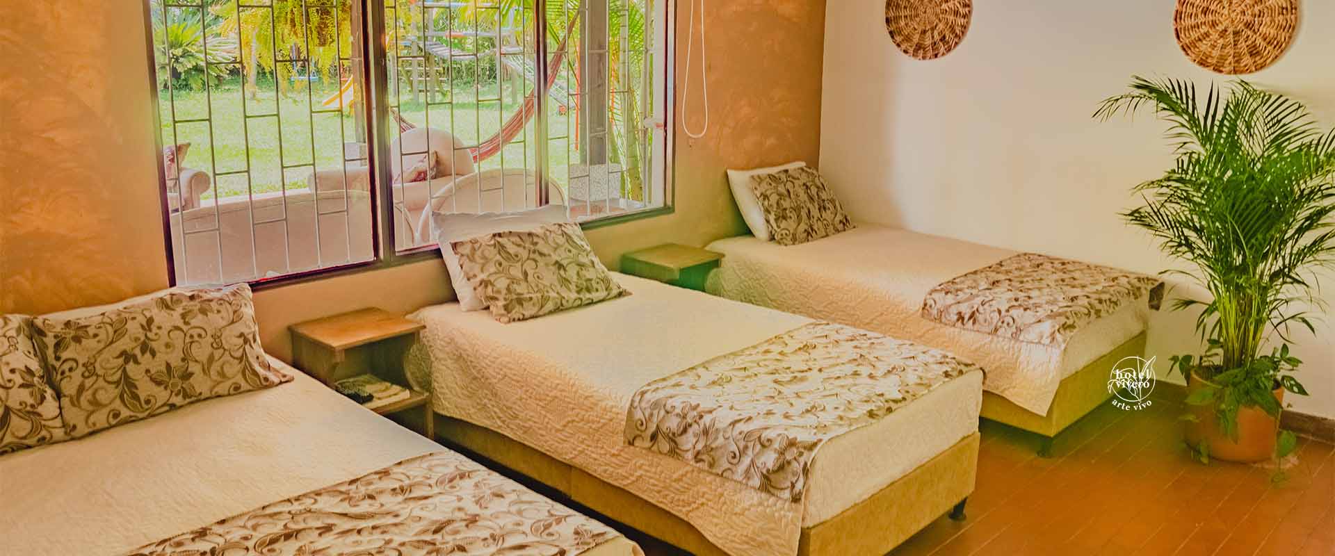 Habitación 01 1-4 La Tebaida, Quindío Descansa en nuestras cómodas habitaciones con diseño contemporáneo. Cuartos amplios con techos altos y adornados con colores relajantes. Todos están acondicionados con bellos muebles, baño con agua caliente y televisión. Reservar Servicios incluidosTVAgua CalienteBaño PrivadoDesayunoCamas 1 Doble 2 SencillasRecomendaciones Check in: 3 PM Check out: 11 AM No se aceptan mascotas